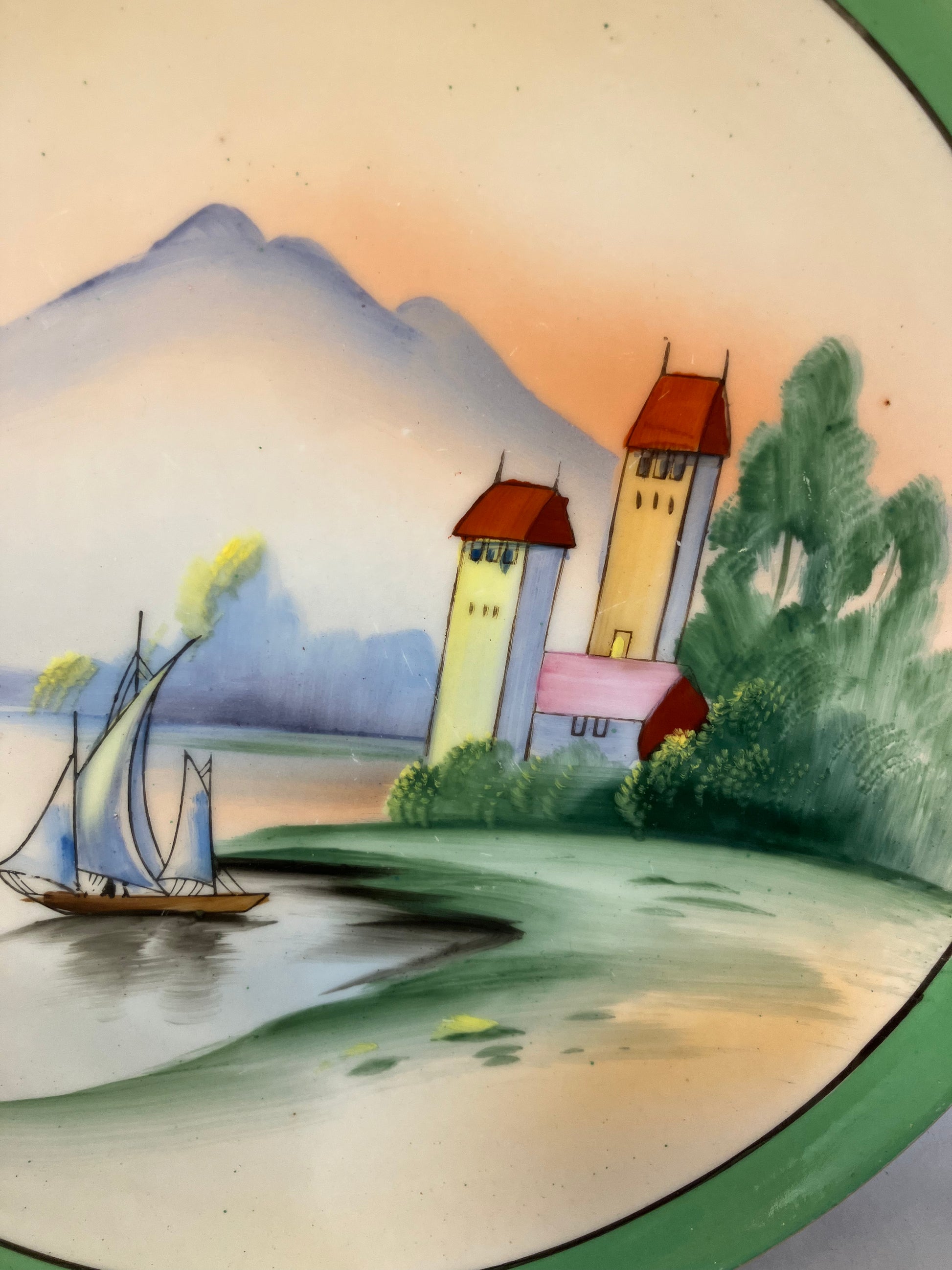 Measuring approximately 9½ inches wide, this plate is an ideal size for display on a plate stand or wall hanger, where the landscape can be fully appreciated. It also works beautifully as a decorative cake or serving plate for special occasions.