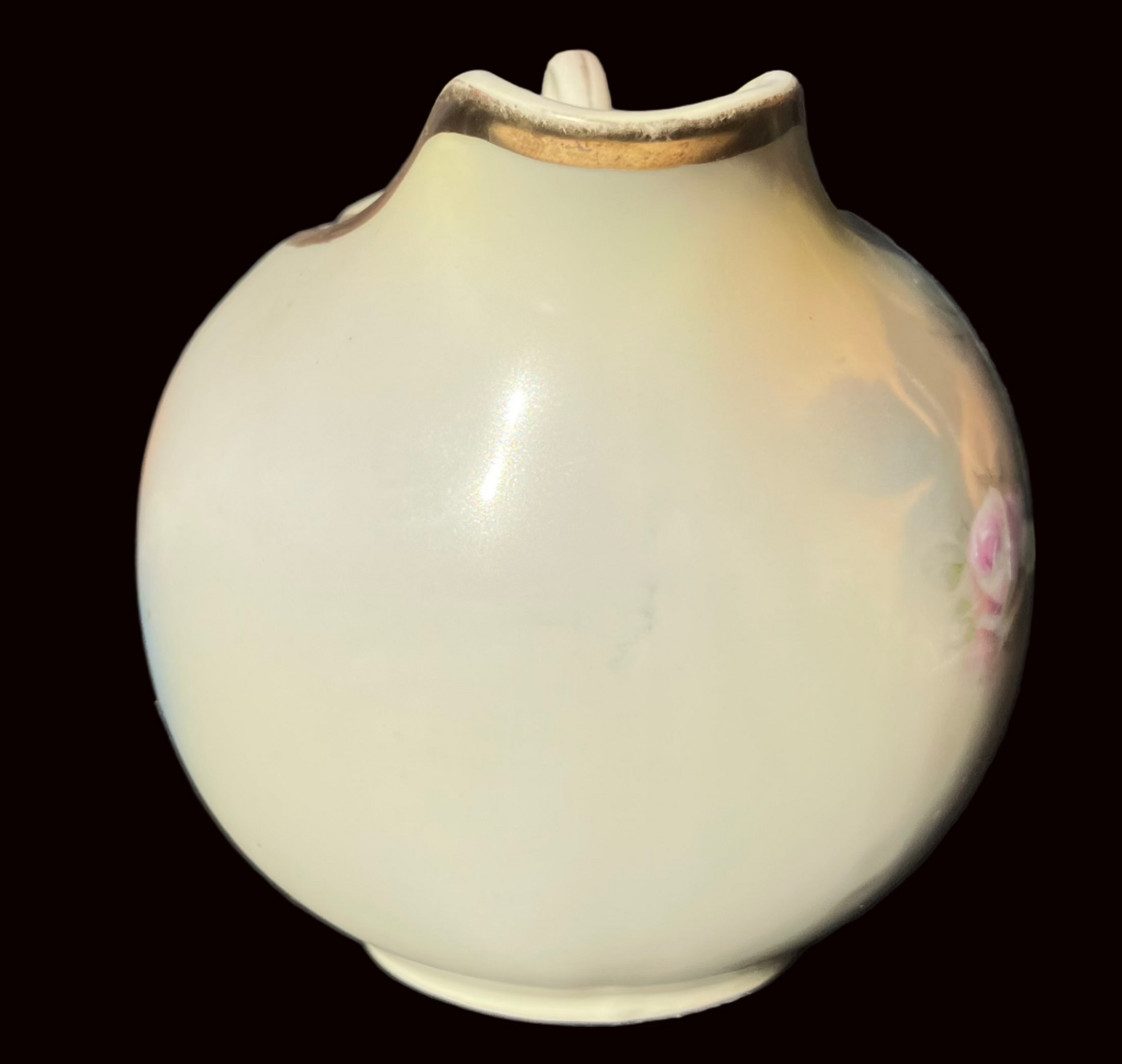 This charming antique handpainted covered creamer is marked Bavaria, 76, and features the PSAG crown mark for Paul Schneider AG. Elegant and feminine, this porcelain piece showcases pastel roses, soft shading, and gold trim—a beautiful example of antique Bavarian artistry.