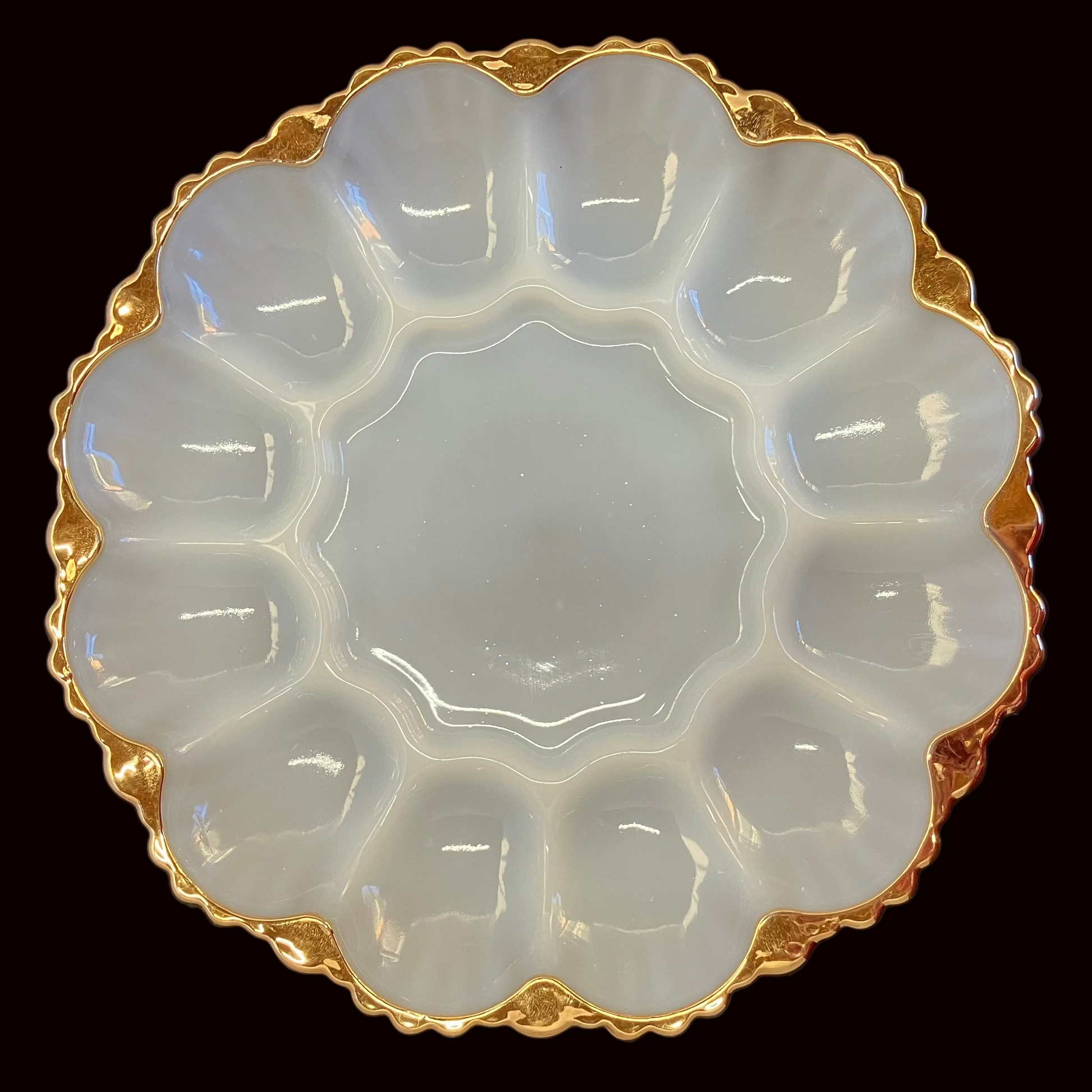 Serve in classic retro style with this beautiful mid-century Anchor Hocking milk glass deviled egg plate. Featuring 12 egg slots and a center well perfect for olives, pickles, dips, or garnishes, this piece is both functional and elegant. The bold gold trim adds a touch of vintage sophistication, making it ideal for entertaining or display.