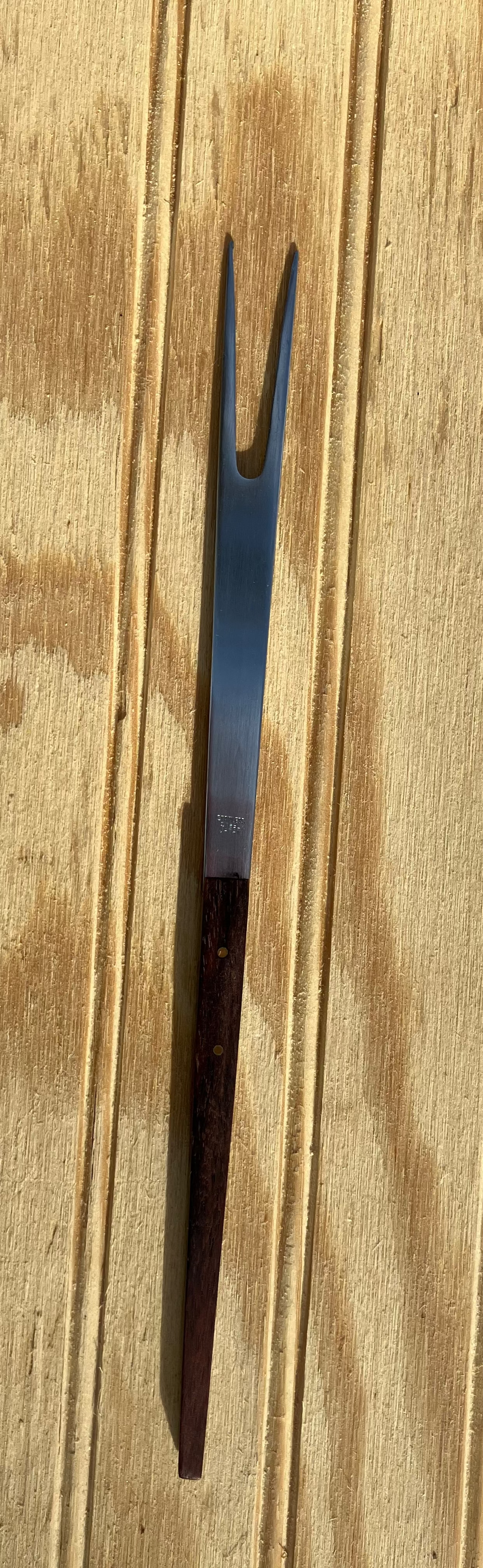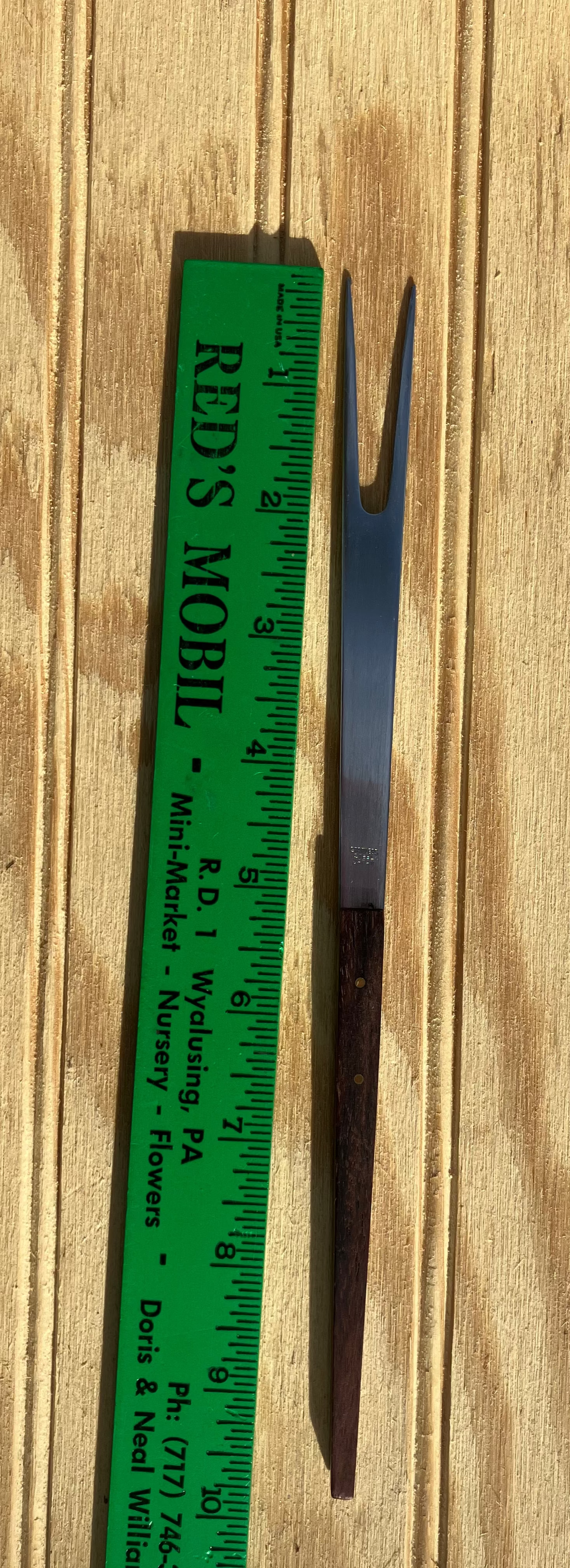 Bring timeless mid-century style to your next gathering with this set of 8 vintage fondue forks. Each fork features a sleek stainless steel tine and a dark-stained wooden handle, possibly rosewood or walnut, for that warm, classic look.