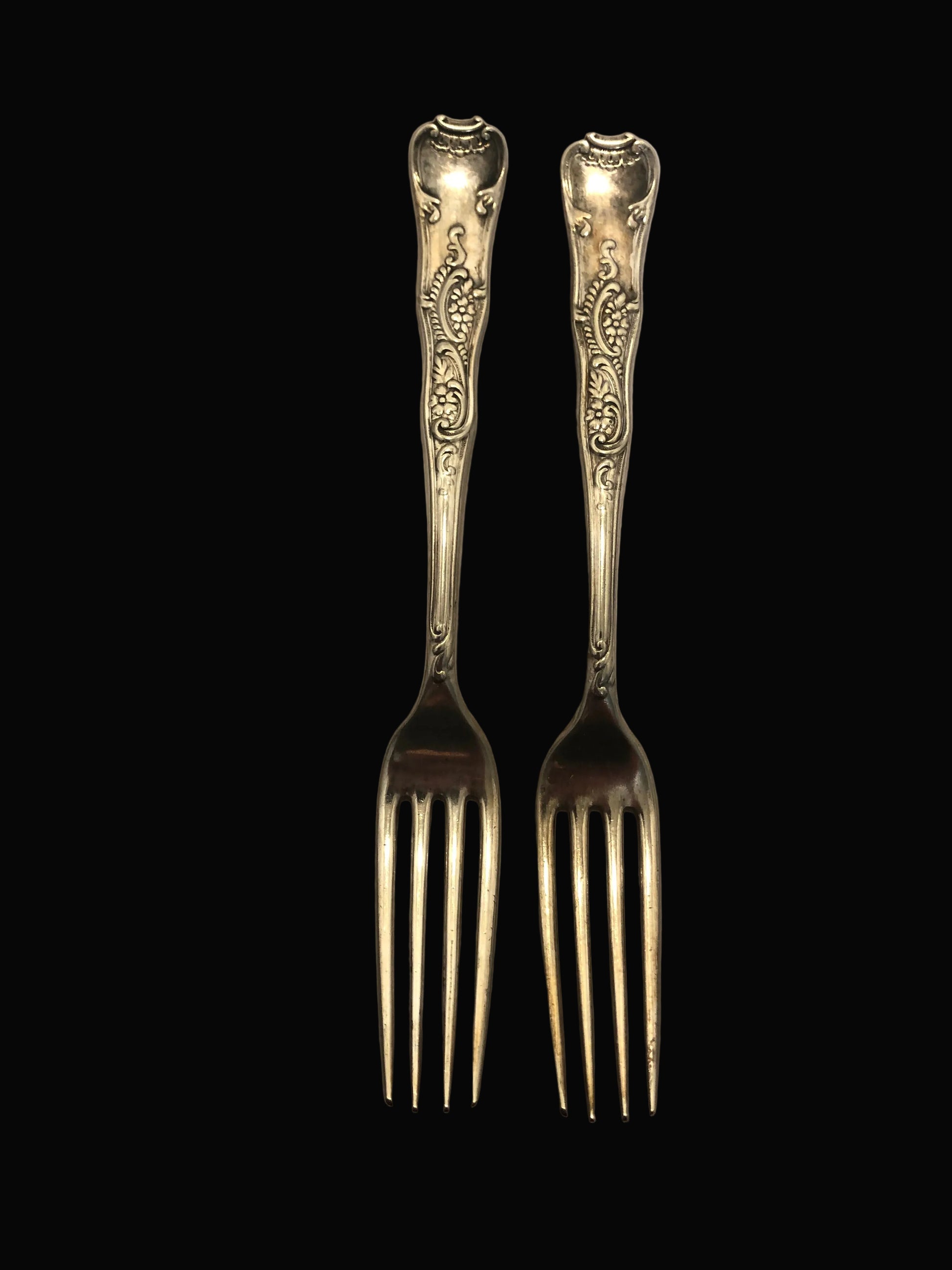 Crafted in silver plate, each fork measures approximately 7 1/2 inches long and is ideal as a replacement piece, for everyday use, or for completing a vintage flatware set. Both forks are in very good antique condition, with age-appropriate wear consistent with their history, yet they retain a pleasing shine and crisp pattern details.