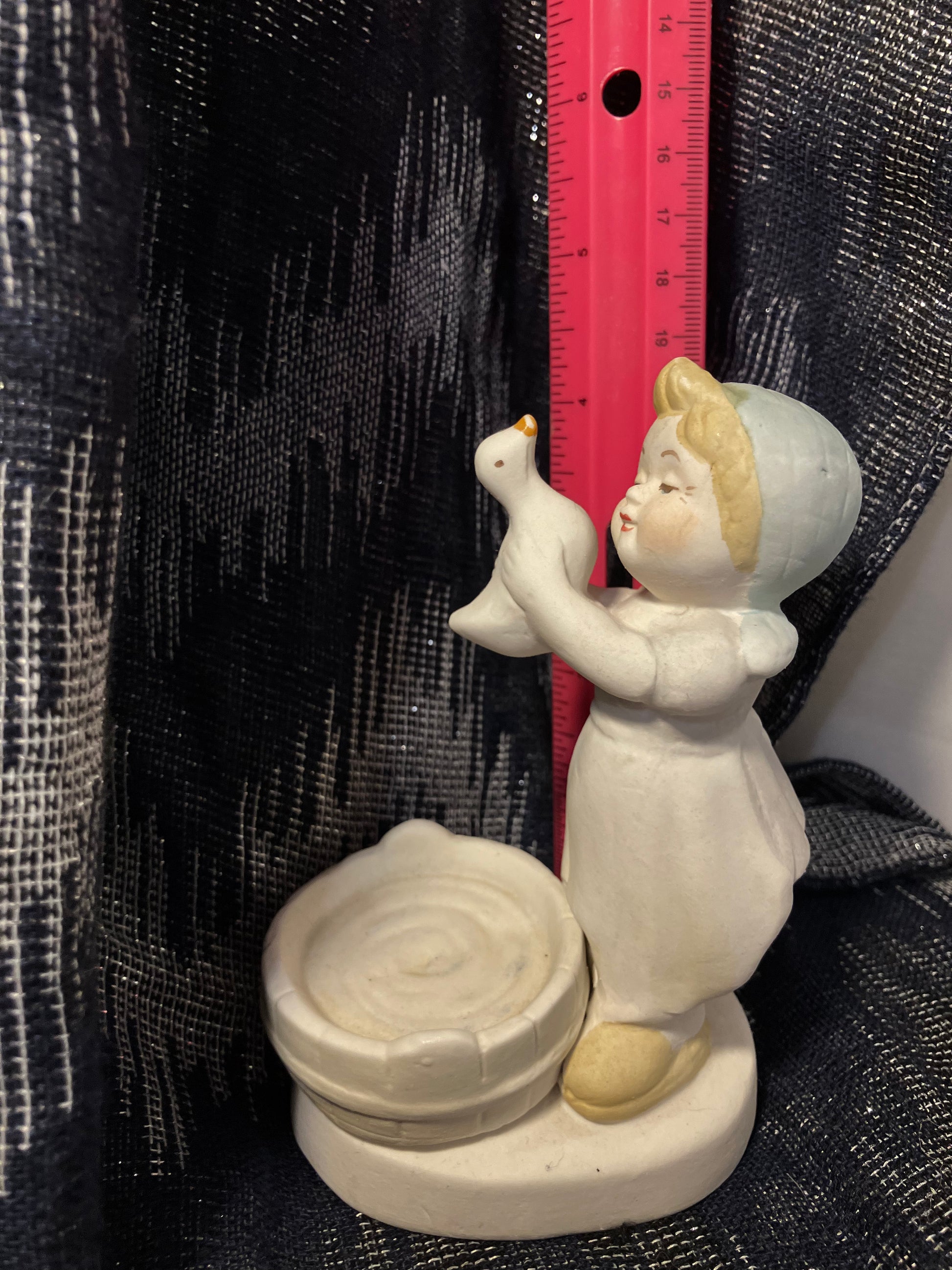 This adorable piece features a young girl holding a duck, finished in soft pastel colors that suit farmhouse, cottagecore, and country-style décor beautifully.