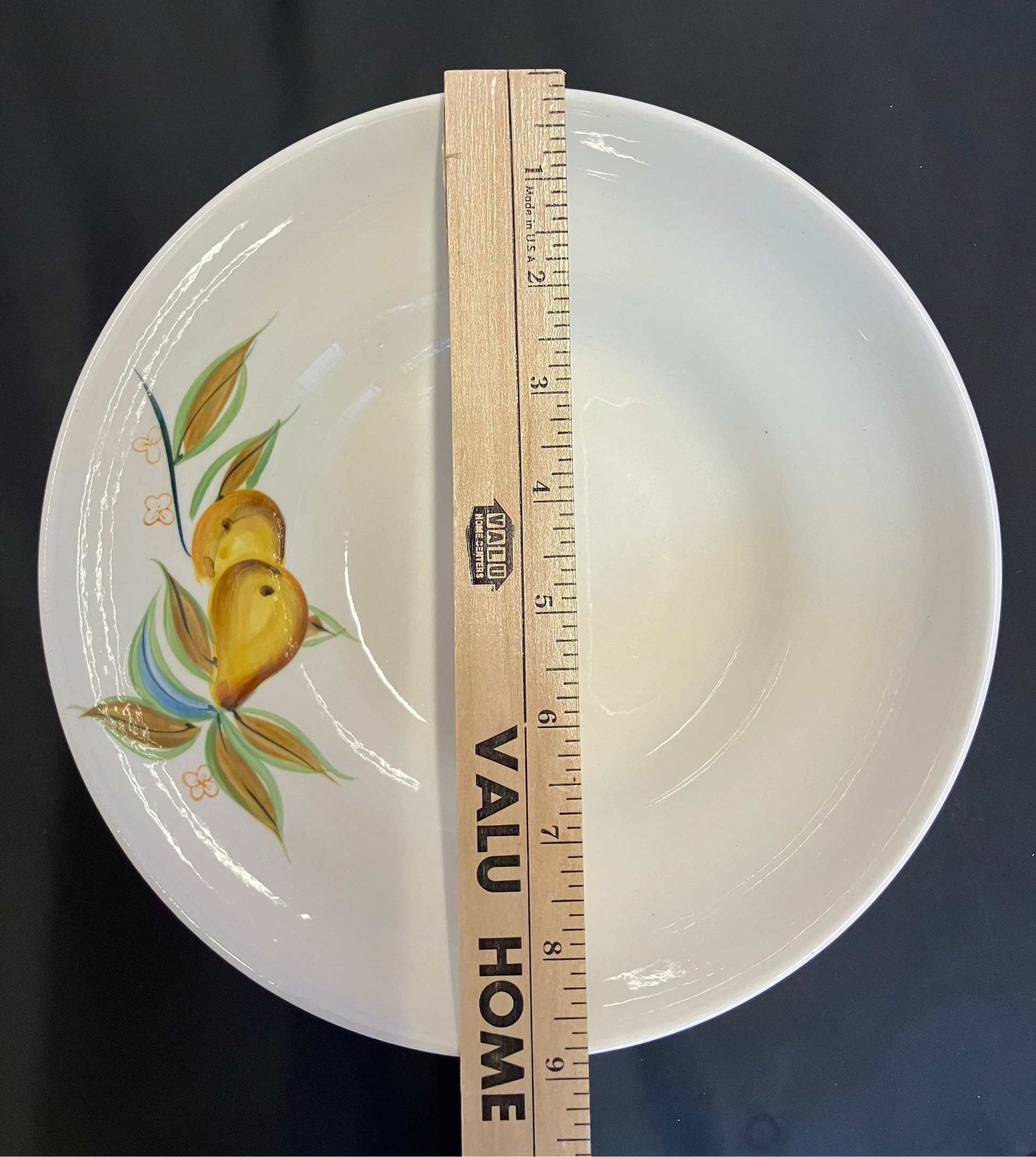 This vintage Vitrastone bowl from Kasugai, Japan, designed by Ben Seibel, beautifully captures the clean lines and organic charm of Mid Century Modern design. The bowl features a cheerful pear motif inside with a yellow and white exterior, and the underside is clearly marked: