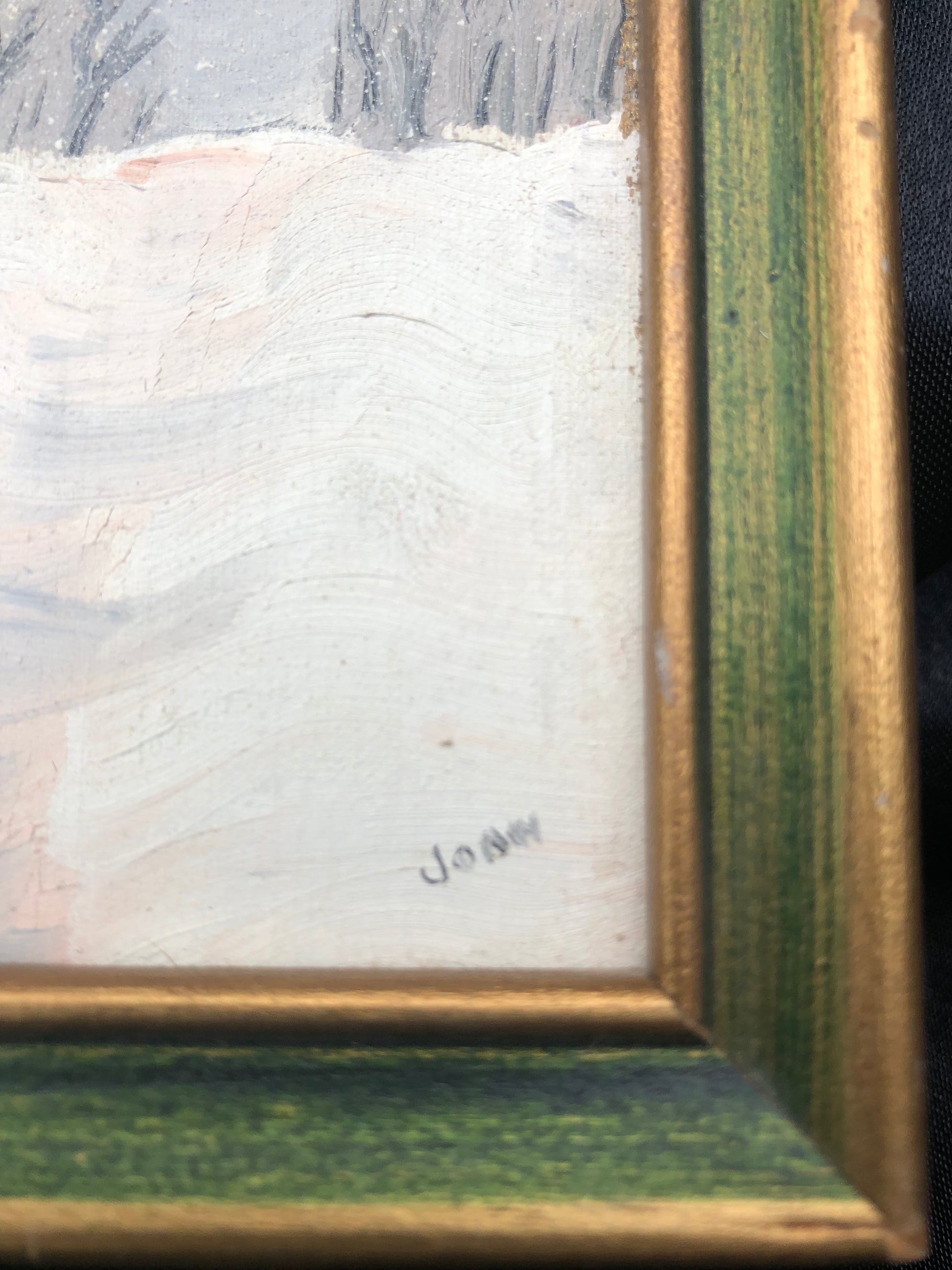 Bring a touch of rustic charm to your home with this vintage miniature original painting, signed Joan (?). This lovely winter landscape scene features a quiet barn, wooden fence, and snow-covered ground, capturing the still beauty of the season.