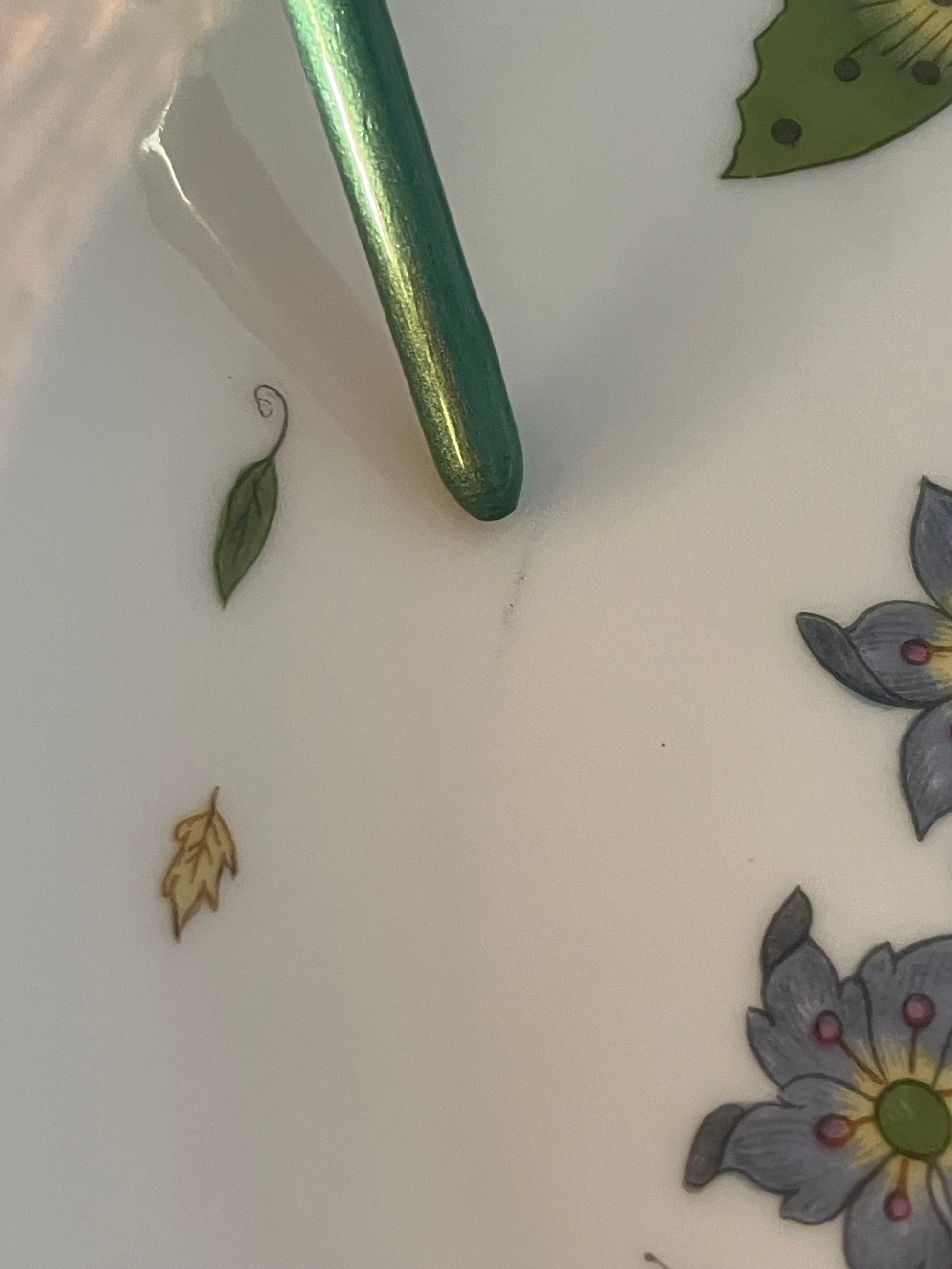 -Plate: good condition with light grey scuff/scratch + glaze drop on rim