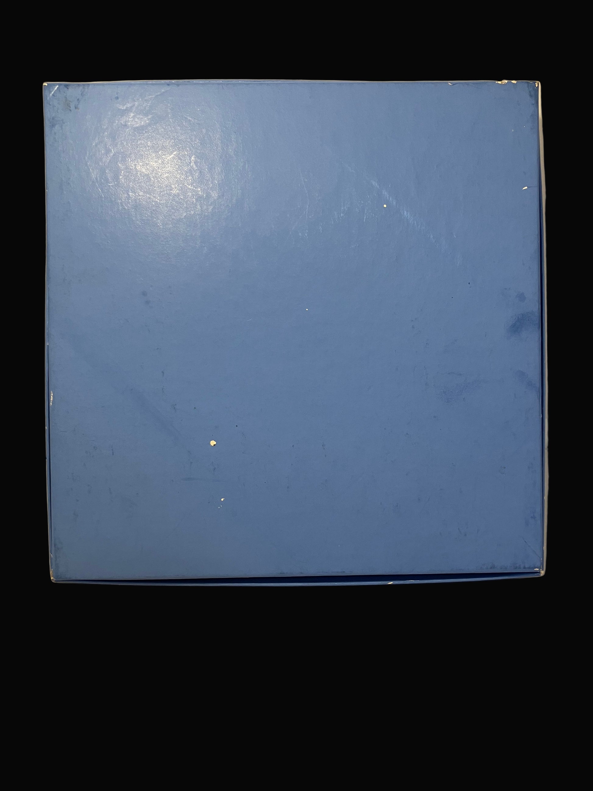 The plate is in good vintage condition, showing a light grey scuff/scratch and a small drop of glaze on the rim from manufacturing. The box shows rubs and minor edge/corner wear typical of age but still protects and presents the piece well.