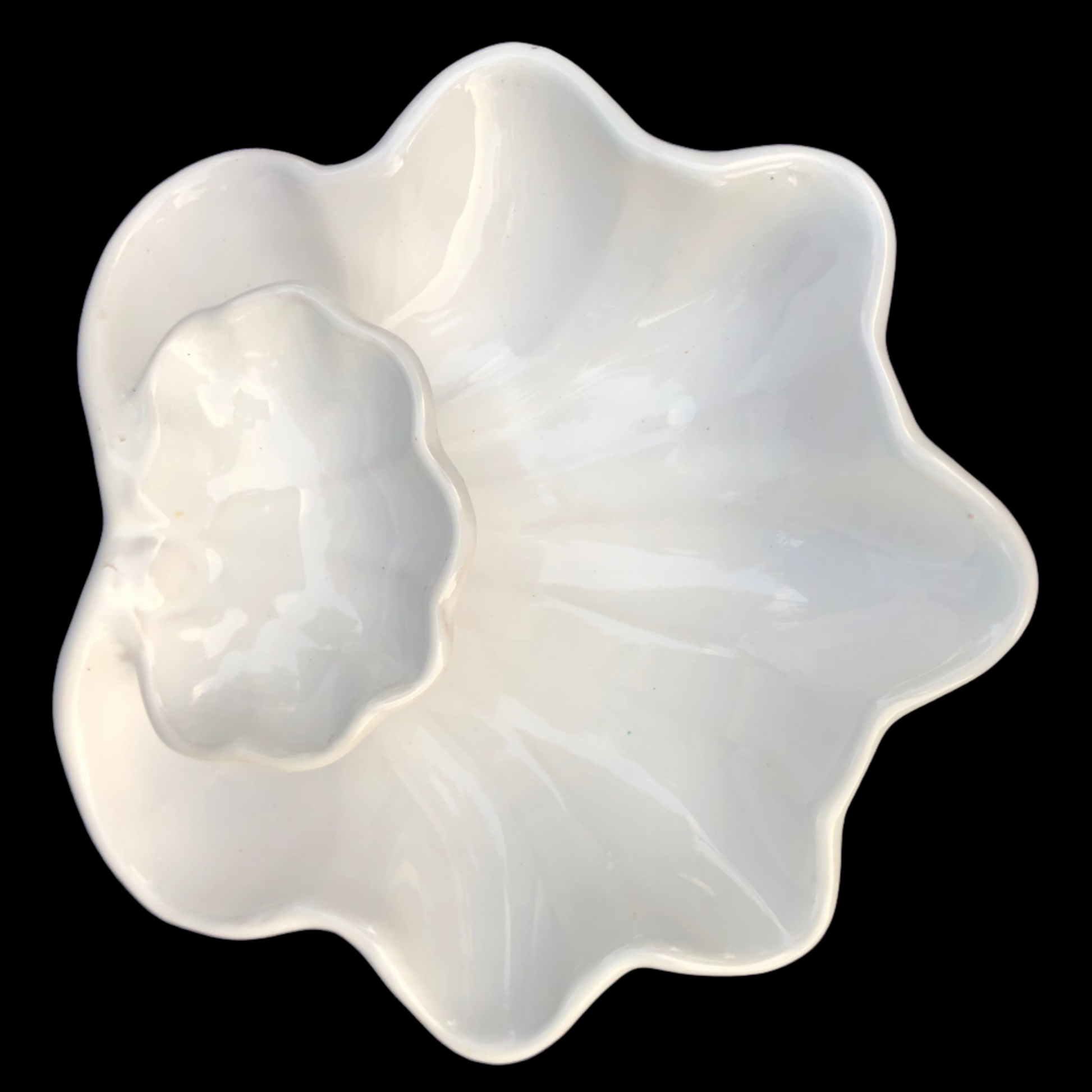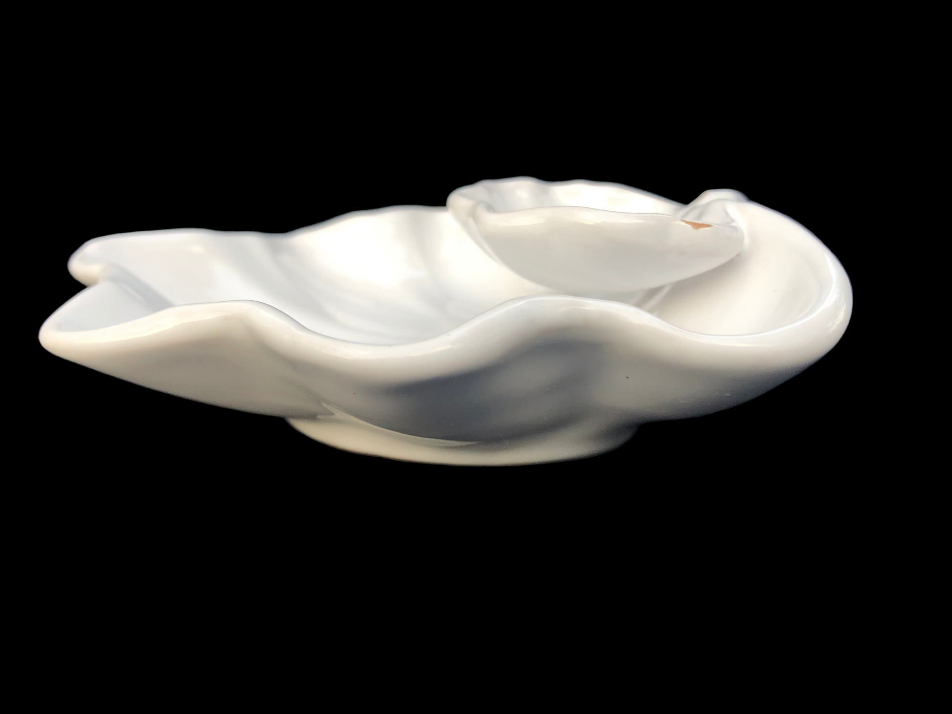 Bring a touch of coastal charm to your home with this pair of vintage pottery shell dishes, marked Italy 09017. Crafted in a creamy white glaze, each dish features a lovely two-tiered shell design, perfect for adding a subtle nautical accent to your space.