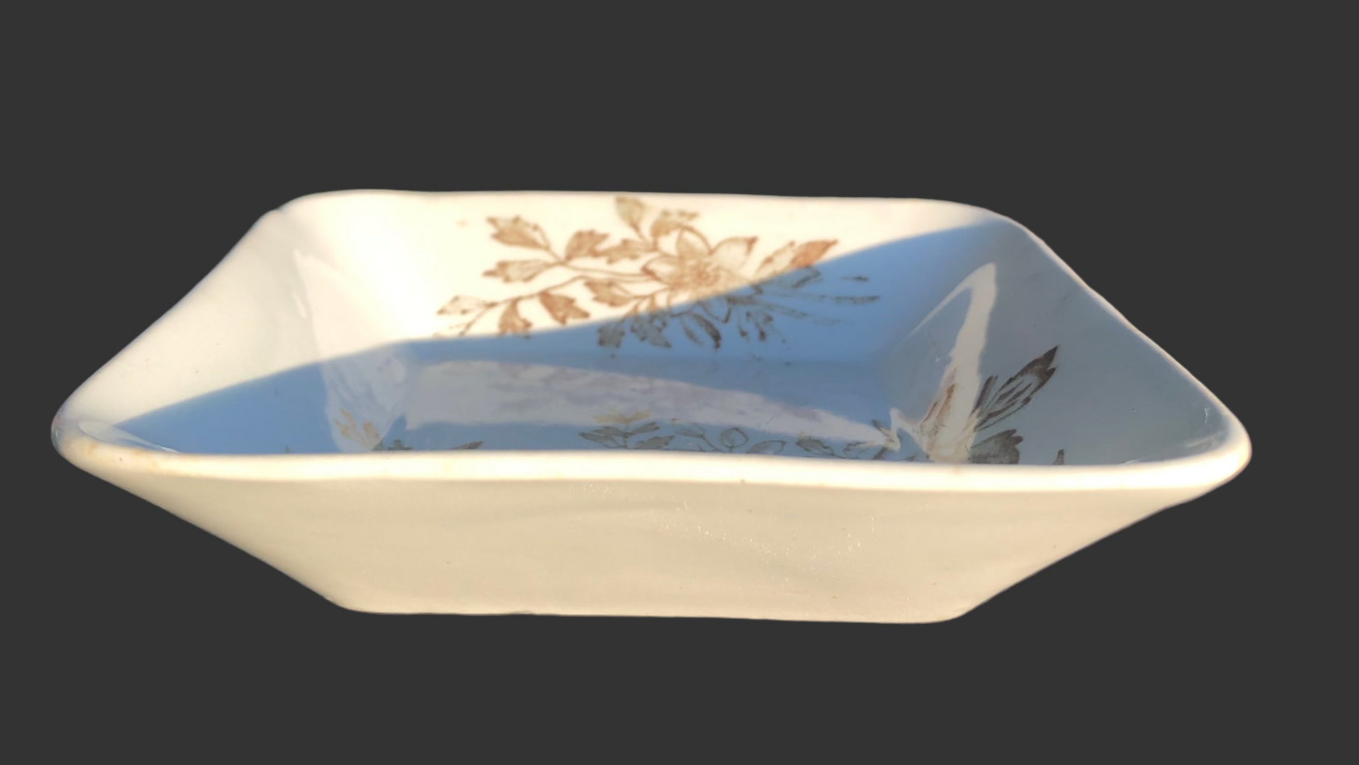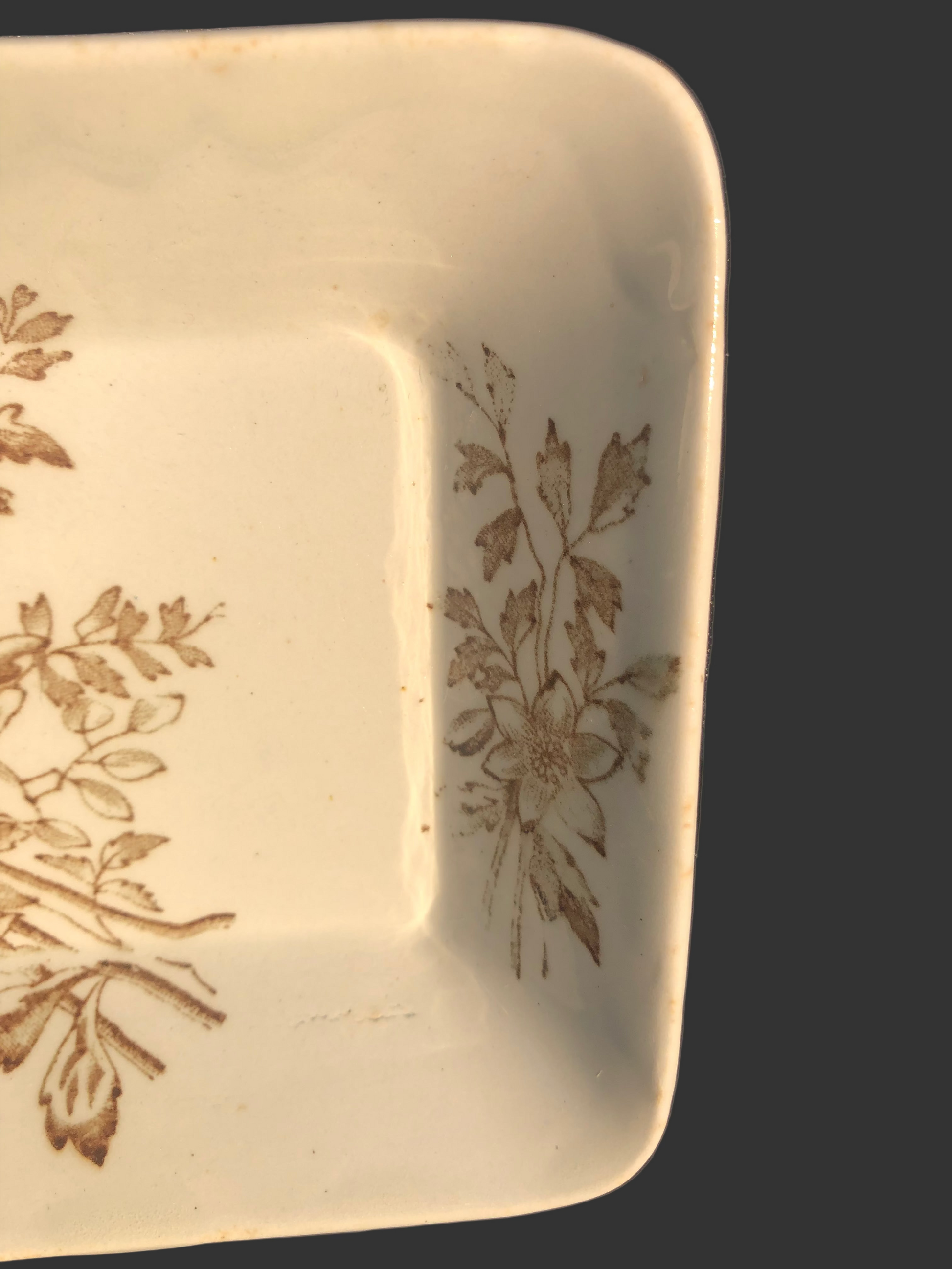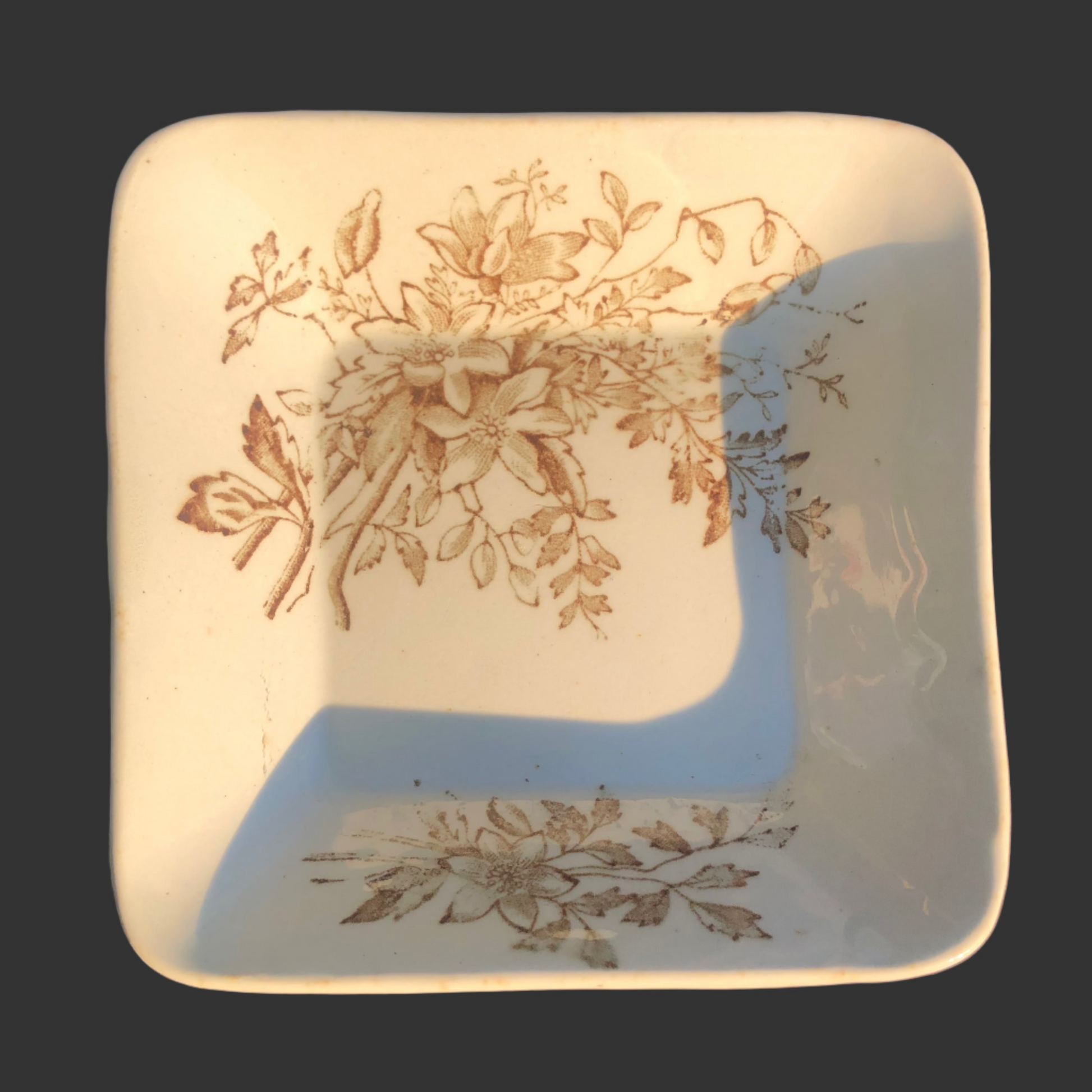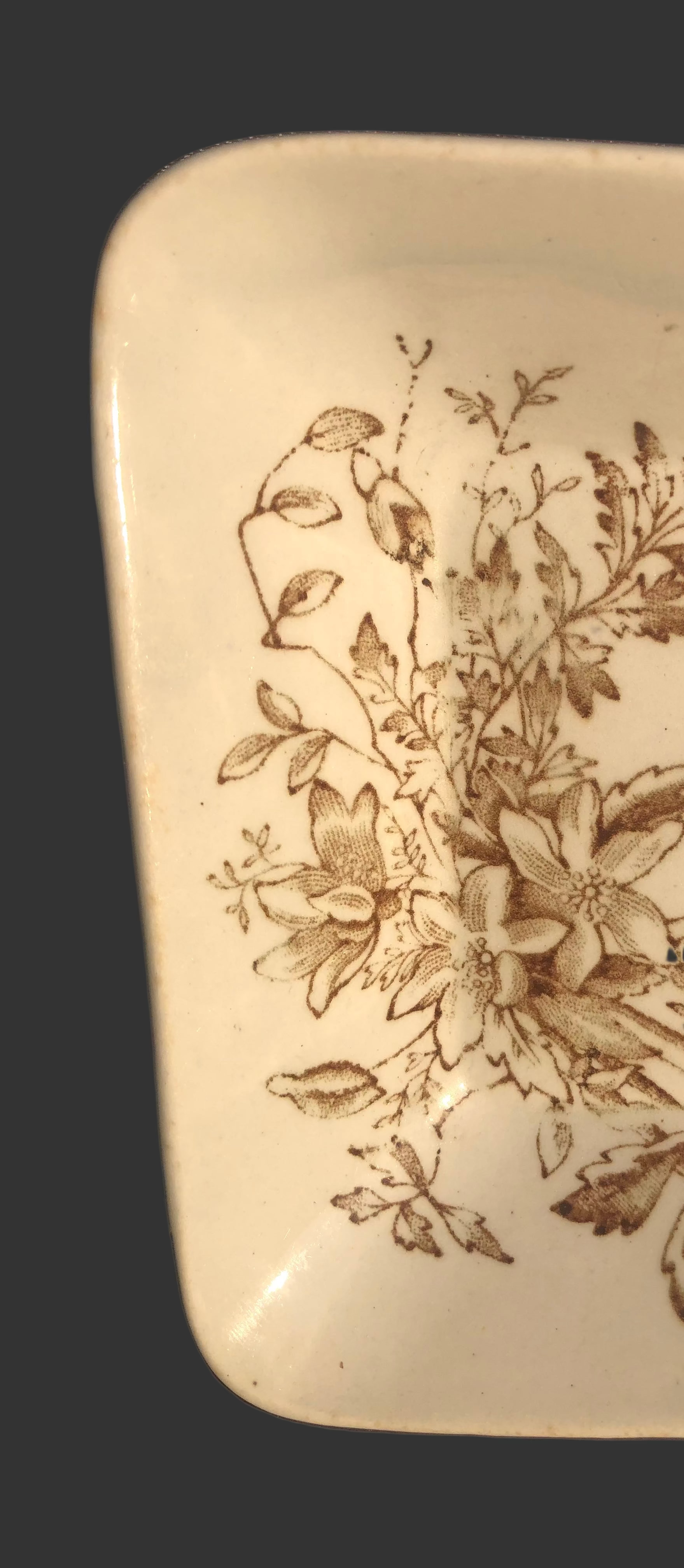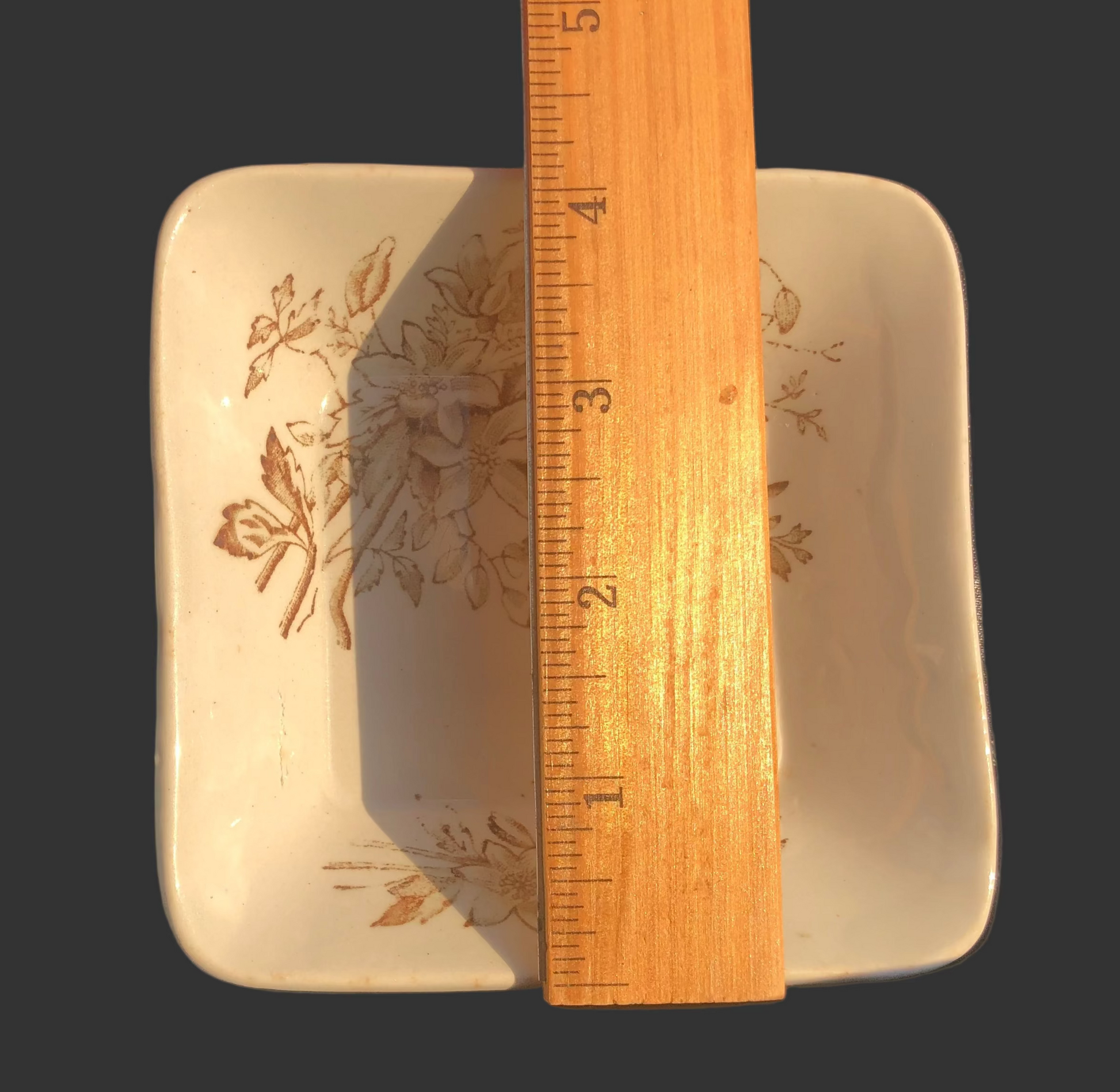 Antique Ironstone Dish, 1800s Brown Transferware, Aesthetic Period Wildflower, 4.5” Square Trinket or Nut Dish
