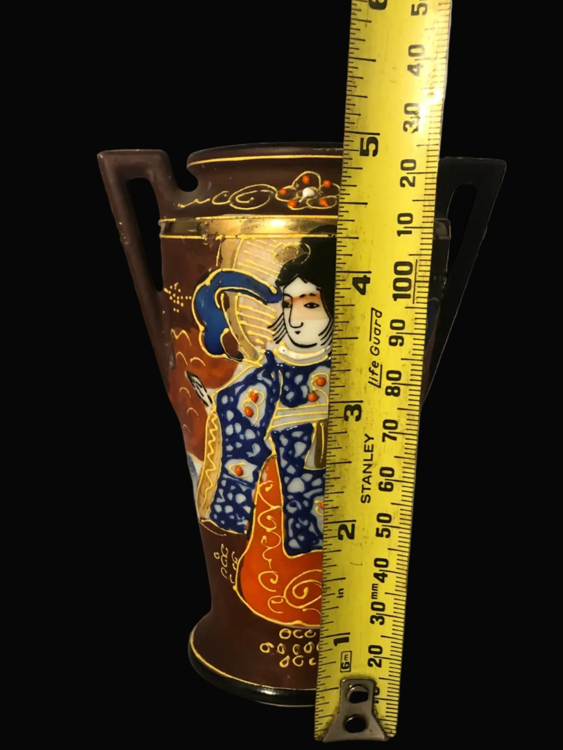 Make a striking statement with this vintage Japanese Satsuma-style vase, beautifully decorated with a detailed geisha motif and rich moriage (raised enamel) detailing. This eye-catching piece features two elegant handles and a warm, earthy color palette of brown, orange, blue, and gold, highlighted with hand-applied gilt accents.