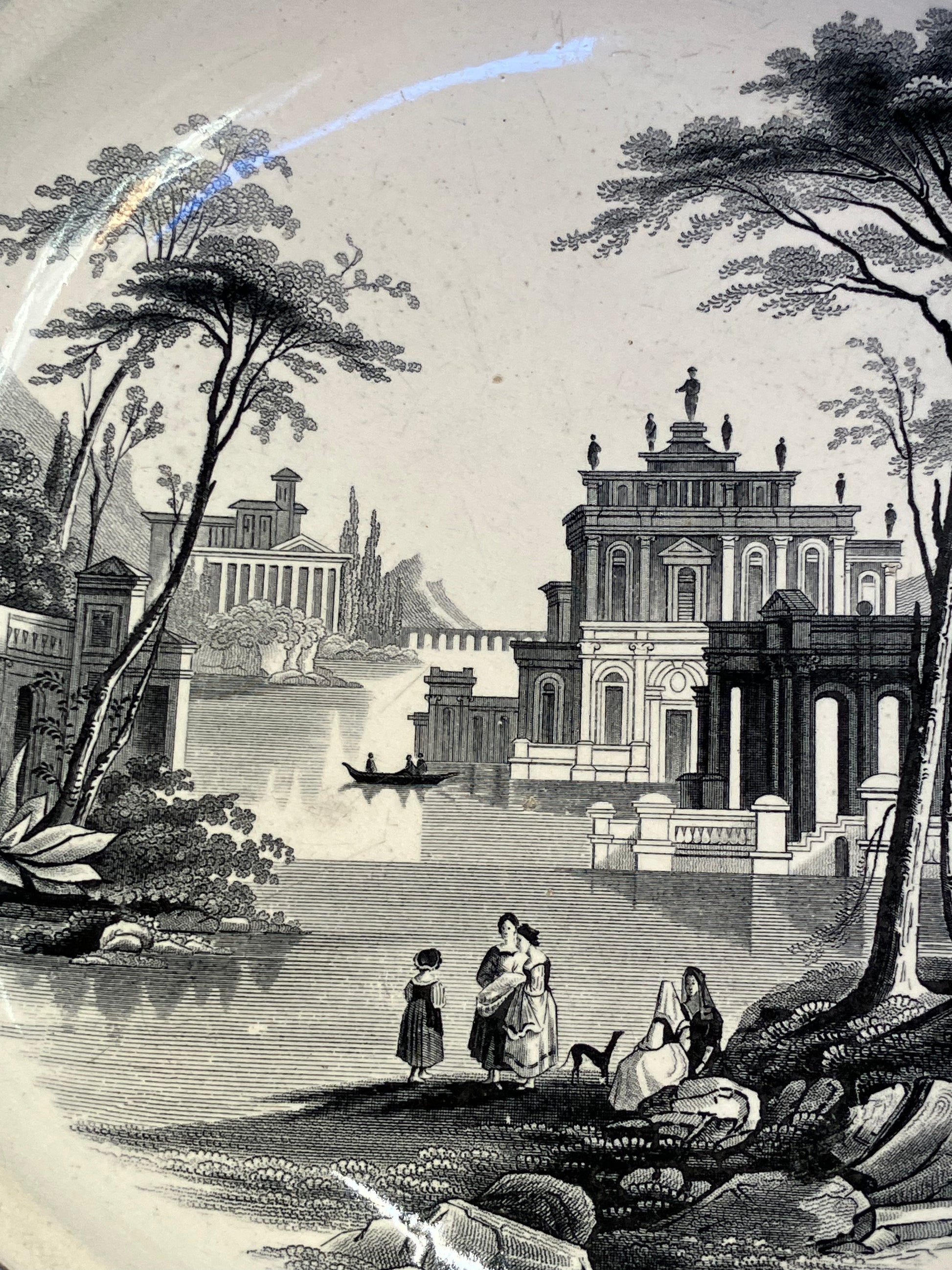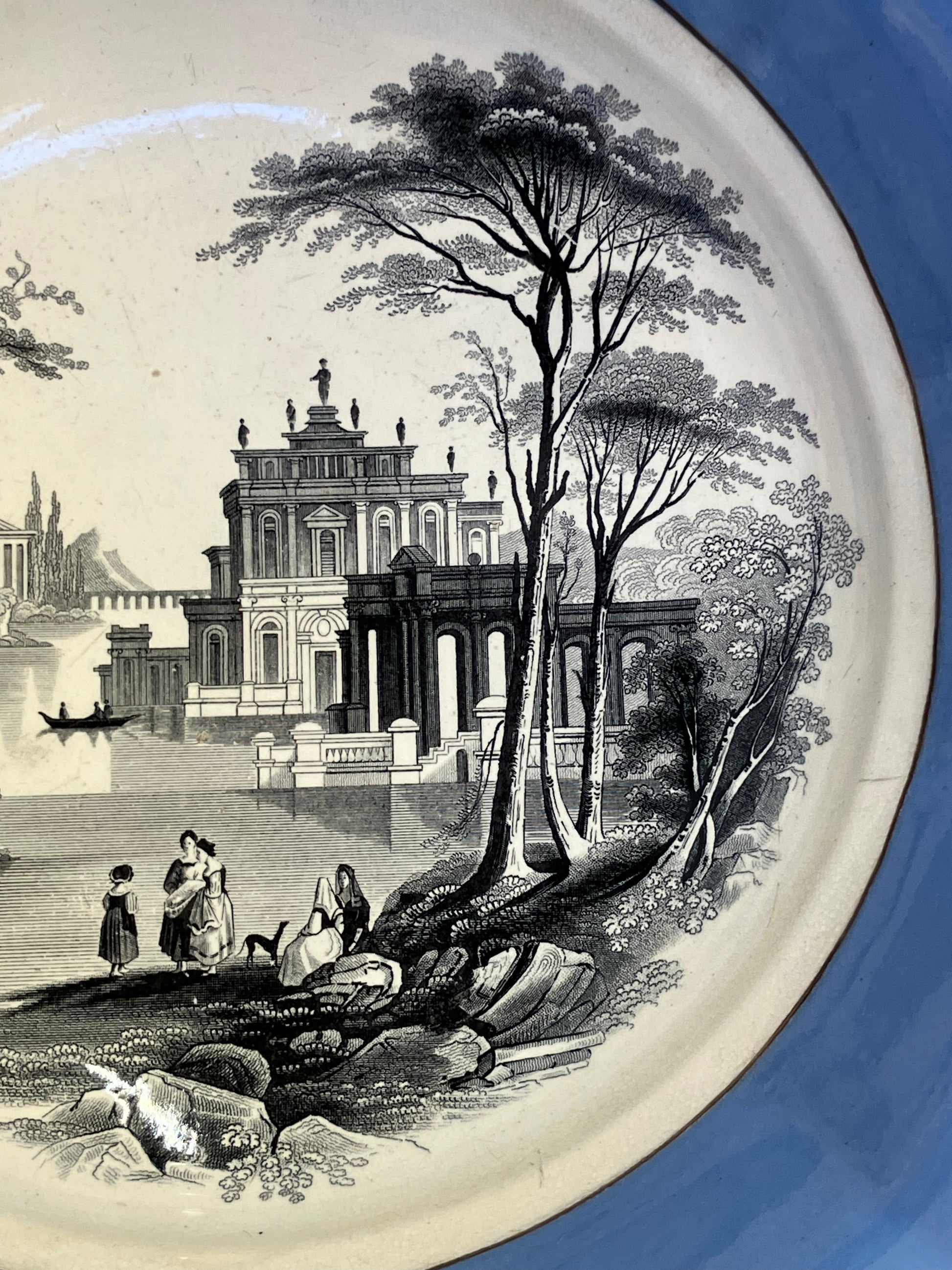 This rare antique English porcelain ironstone bowl is a stunning example of mid-19th century craftsmanship. Bearing an English registration mark from 1844, it features a gorgeous black and white Greco-Roman landscape scene encircled by a blue band with elegant gold accent stripes.