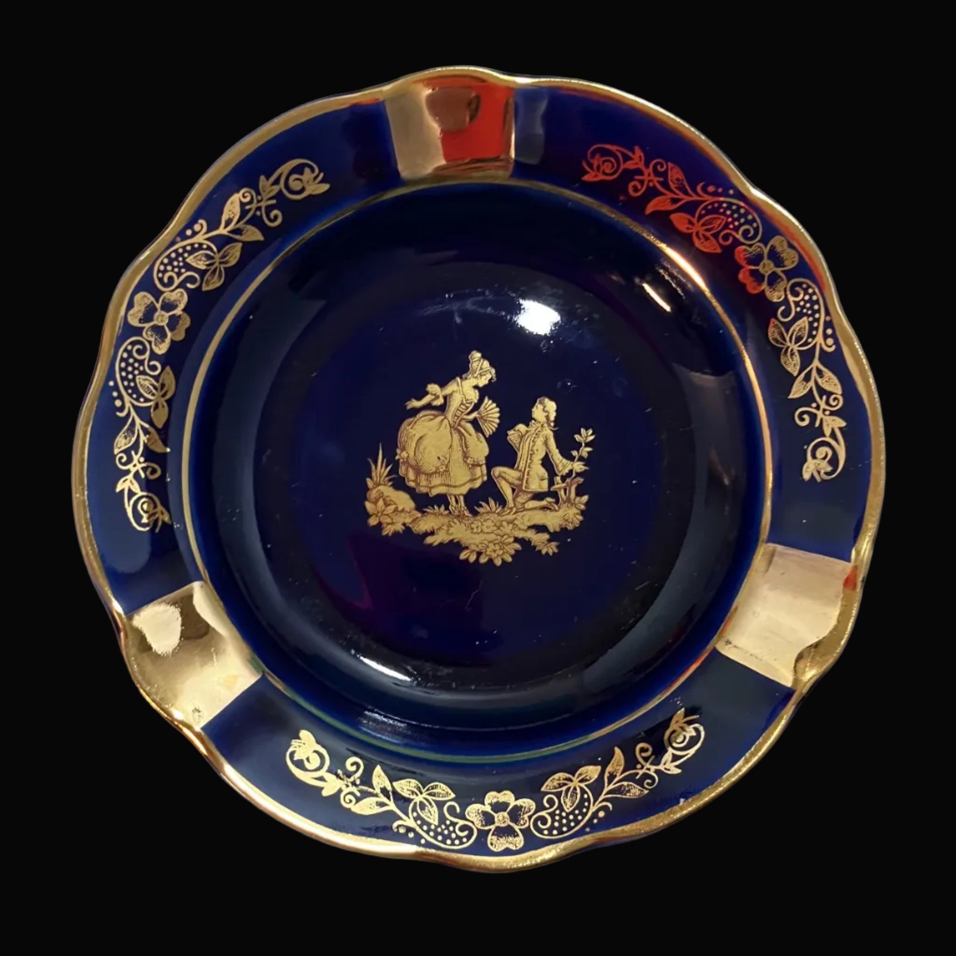 This striking vintage Limoges ashtray features a rich cobalt blue background accented with luminous gold trim and a romantic courting couple motif at the center. Bold and eye-catching, it measures approximately 4 1/2 inches in diameter and can also be used as a trinket dish or decorative accent, perfect for a vanity, dresser, or display shelf.