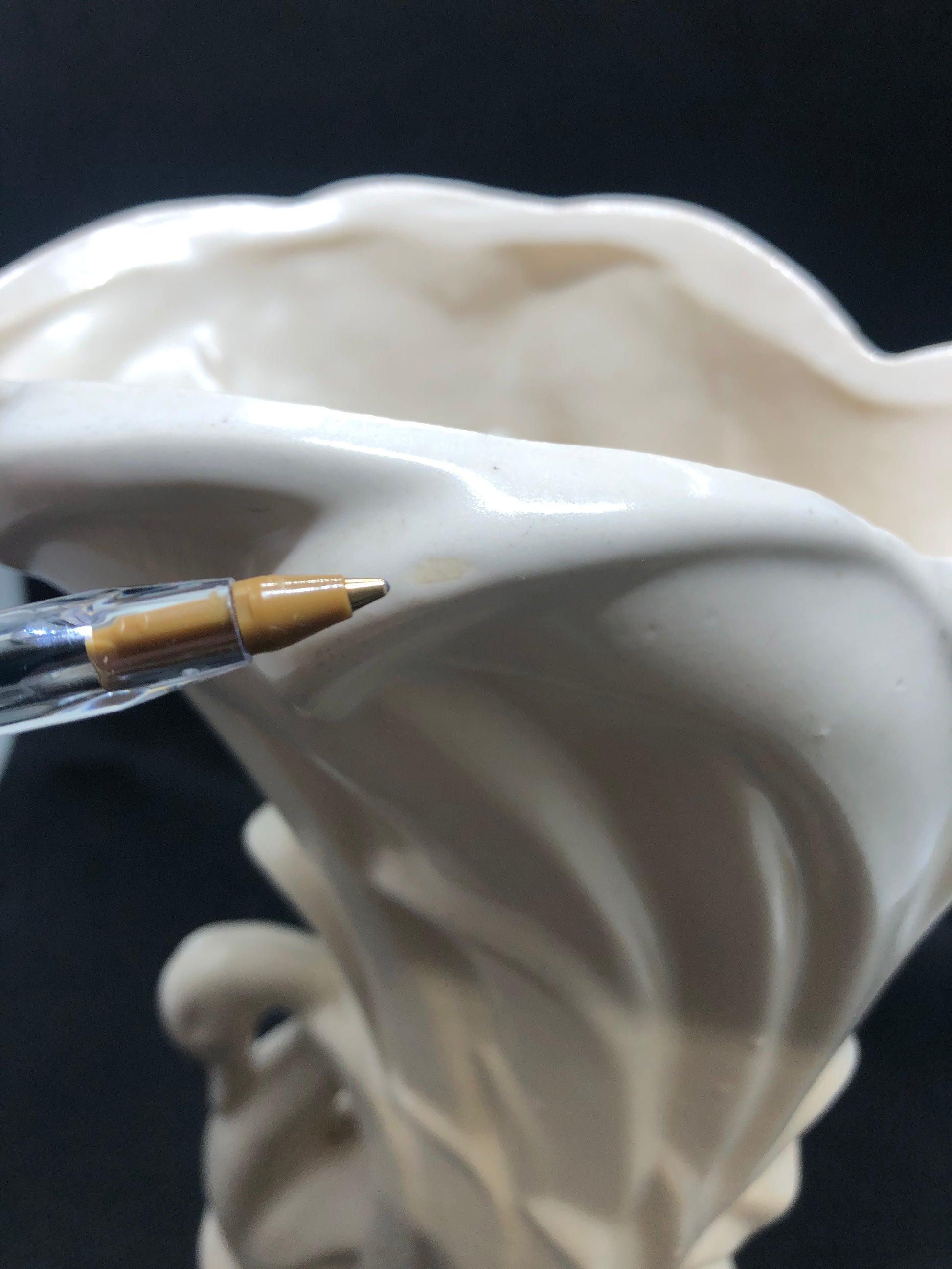 This beautiful vintage McCoy pottery vase from the 1940s features a swan in reeds design in a creamy white color. Standing 9" tall, the vase is in very good condition with a scratch on the inside and some glaze-covered bumps and marks from the manufacturing process, adding to its unique charm.
