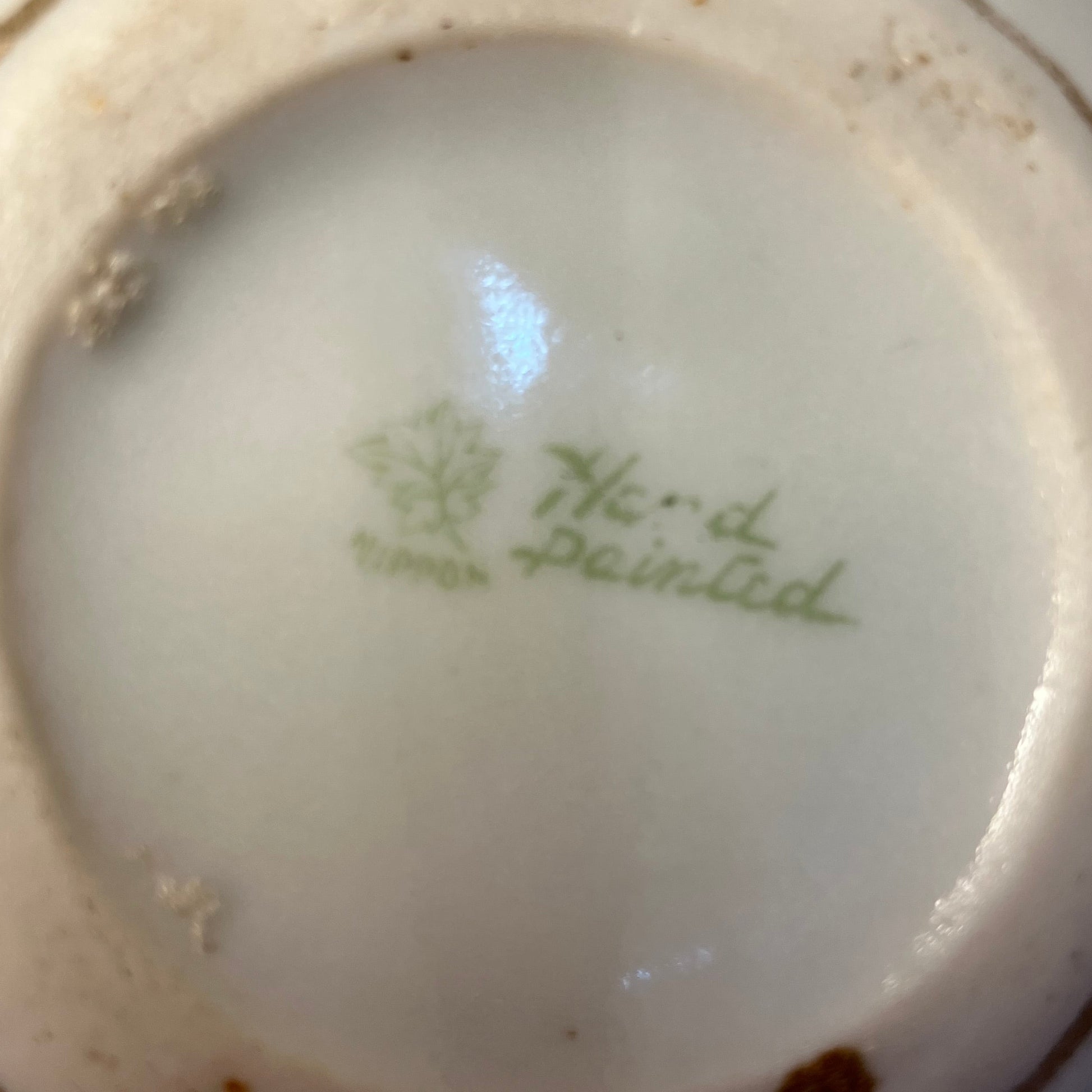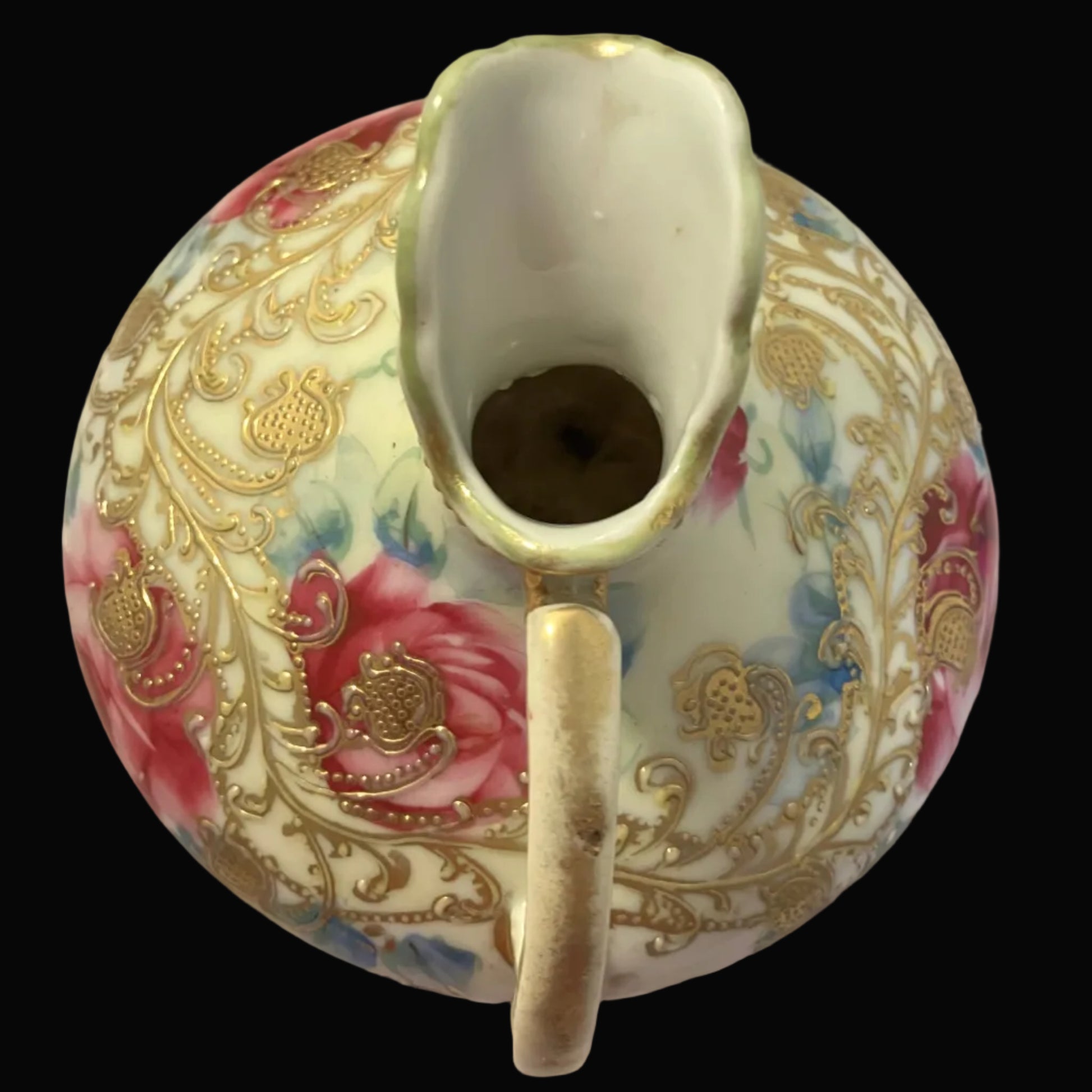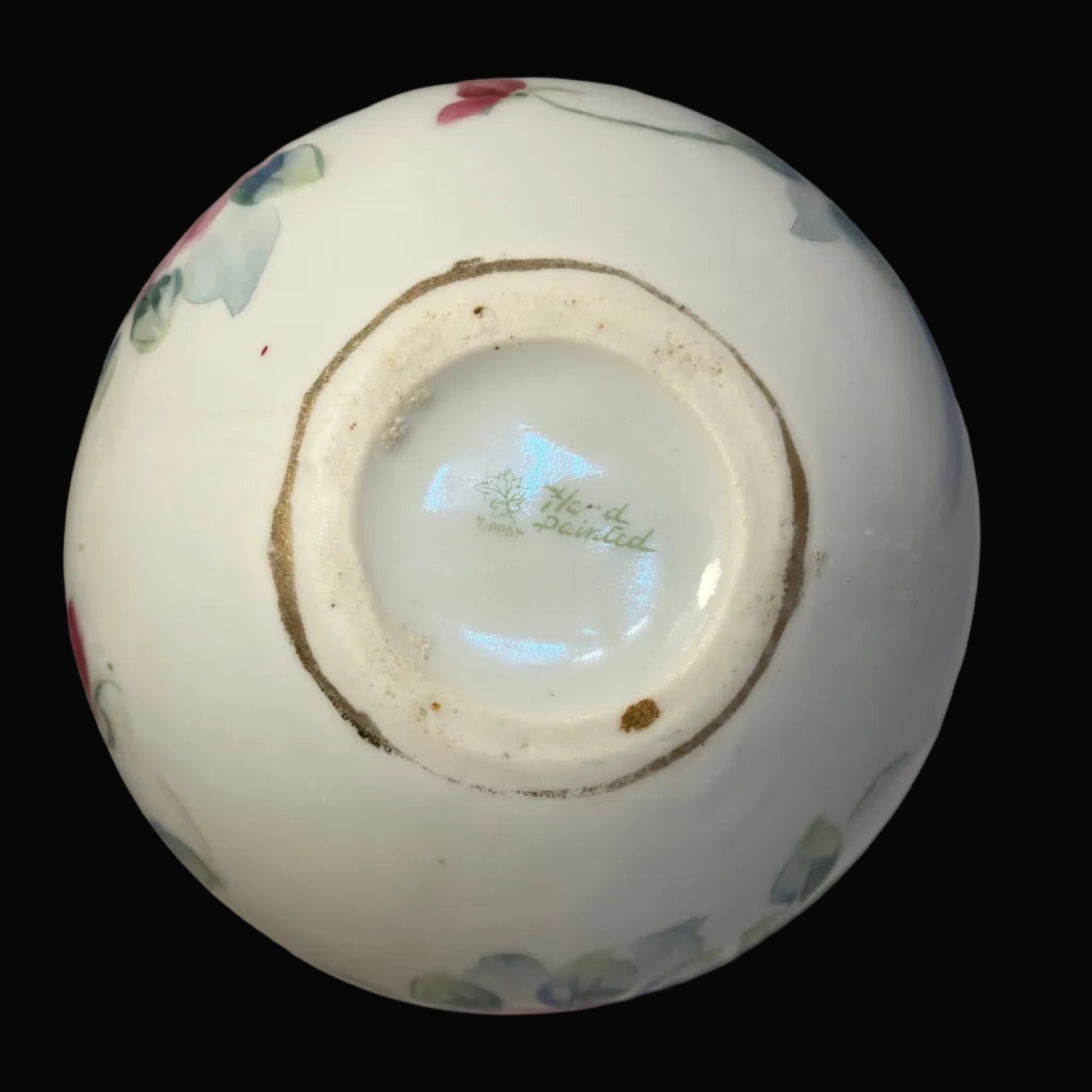 The base bears a green maker’s mark with a maple leaf and hand-painted “Nippon”, dating this piece to the early 20th century, making it well over 100 years old. Despite its age, it remains in very good antique condition. There is expected wear to the gold highlights including the handle and edges, and the gold trim on the base appears to have been touched up at some point (see photos). This area is not visible when displayed and does not detract from its overall beauty.