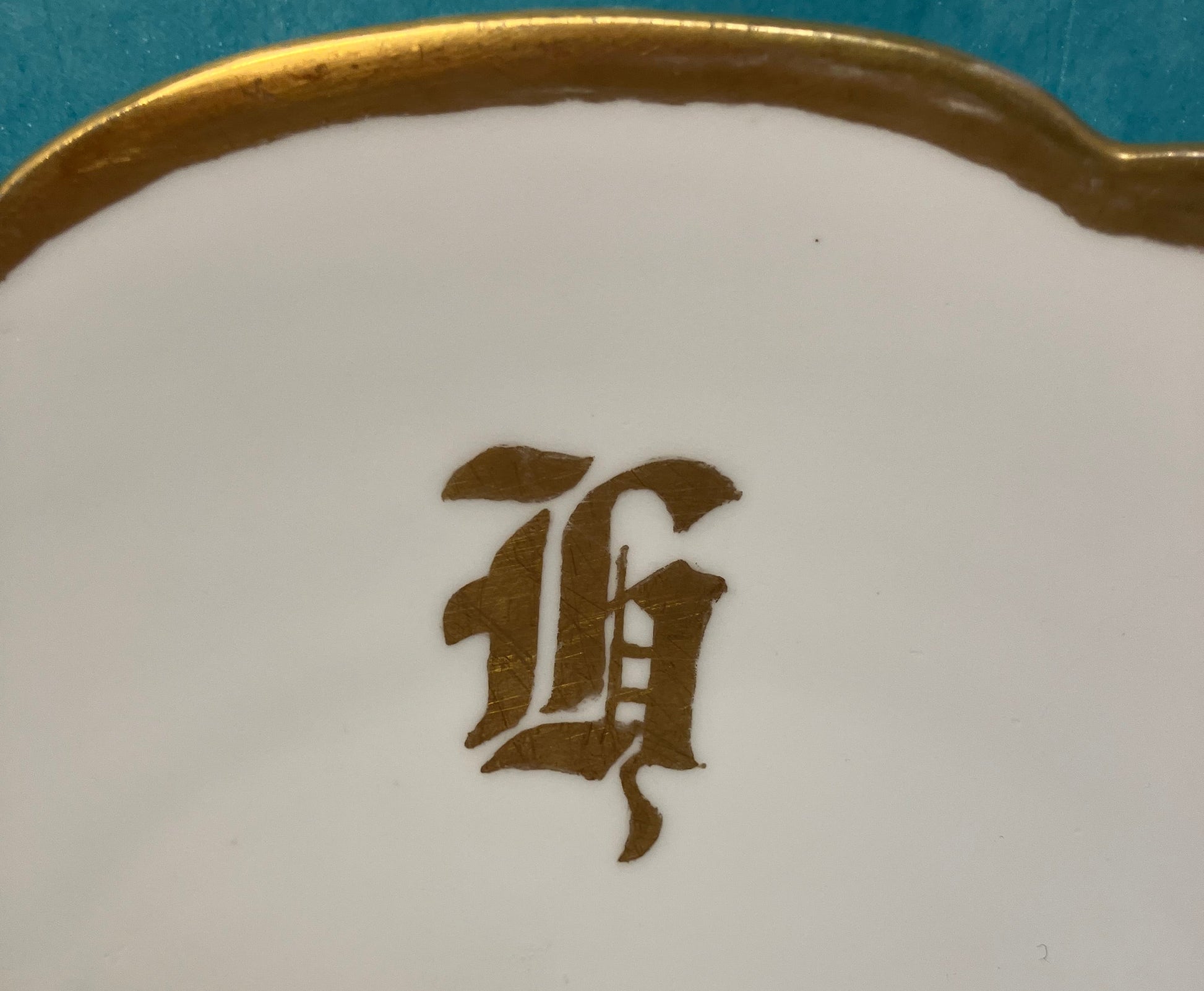 This elegant antique T&V Limoges serving dish was produced in France by Tressemanes & Vogt and bears the desirable green Limoges maker’s mark, dating the piece to approximately 1892–1907. Crafted in classic white porcelain, it features bold gold trim, a refined Old English monogram, and a beautifully scalloped edge.