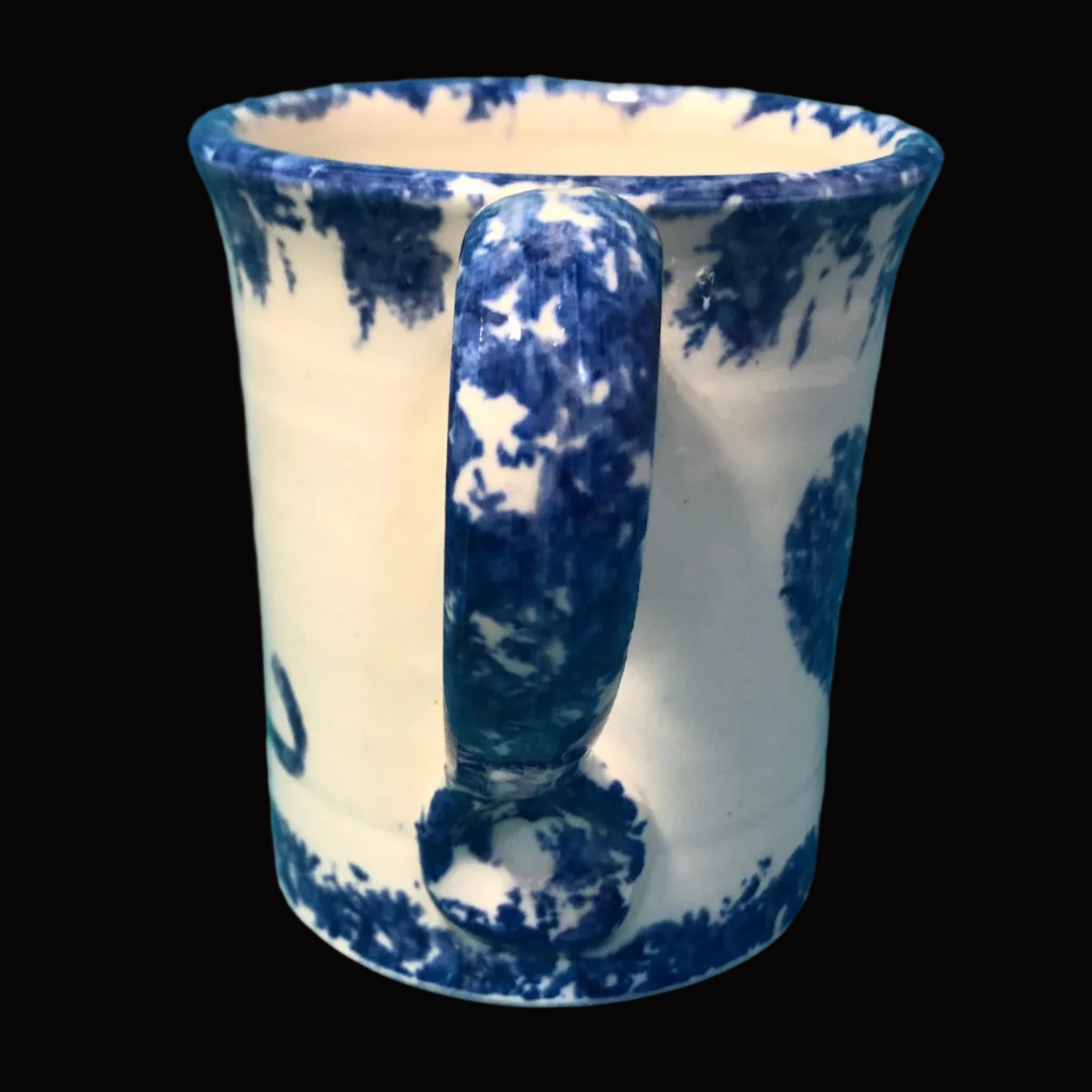 Add charm to your morning coffee with this delightful handcrafted pottery mug, featuring a white background with blue sponge accents, a sweet blue cat and blue heart motif. This cozy mug has a beautifully shaped, comfortable handle and a warm country farmhouse aesthetic that looks lovely on open shelving or in a rustic kitchen.
