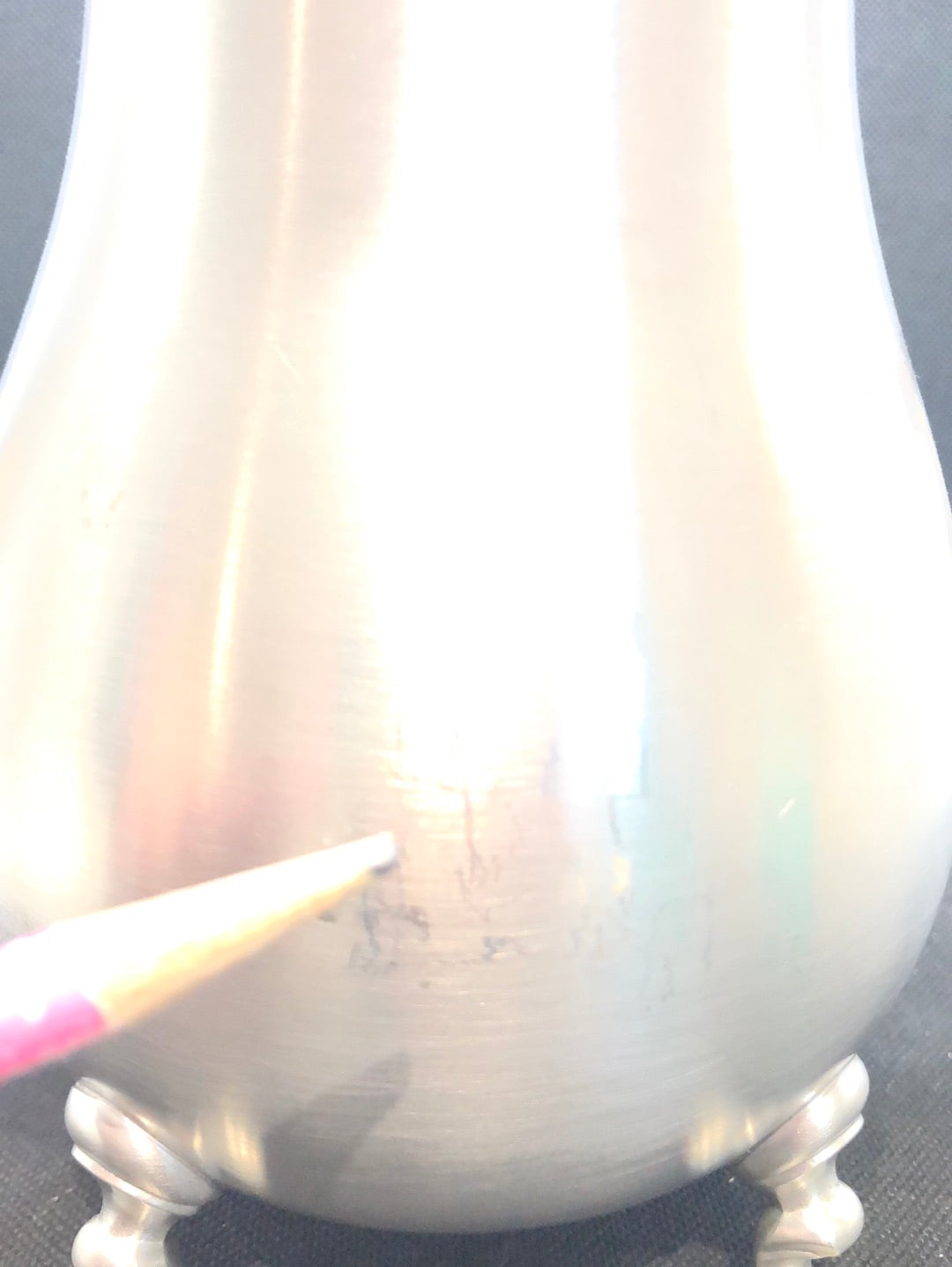 Pewter footed tea/coffee pot by Poole #2225. Has hinged lid and scalloped edge. There are some surface scratches on one side, see photo.